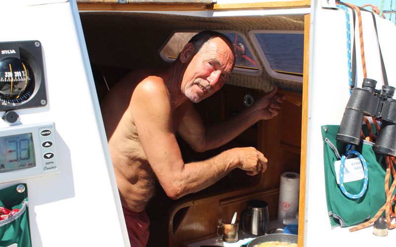 6 lipca – poniedziałek. W nocy wiatr zmienił kierunek i popadał deszcz. O poranku wieje z zachodu, siąpi deszcz. Henryk wybrał się na punkt widokowy, a Piotr sprzątnął pokład, razem uzupełniliśmy wodę w zbiorniku i przyszedł czas na drugie, obfite śniadanie. Punktualnie o 1200 oddaliśmy cumy. Początkowo na silniku, torem w stronę pławy kardynalnej SW-15, wiatr 5° W. Ster przejął Piotr, przy kardynałce odpadliśmy, postawiłem zarefowanego foka, rozwijaliśmy prędkość 4-5 kt. Przy pławie głębokiej wody M-2 zaczęliśmy skracać drogę do pławy MK, oczekiwany kurs udawało się utrzymywać, dalej Piotr utrzymywał kurs na bramę torową nr 3. Wiatr stabilny 5, w porywach 6° B W, stan morza zgodny z prognozą 2, co dla naszego jachtu oznaczało sporą falę nadchodzącą prostopadle do prawej burty. Po zamianie kursu na bramę torową nr 3, już spokojnie mogliśmy utrzymywać kurs baksztagowy, co znacznie uspokoiło żeglugę, a jednocześnie zwiększyło prędkość.