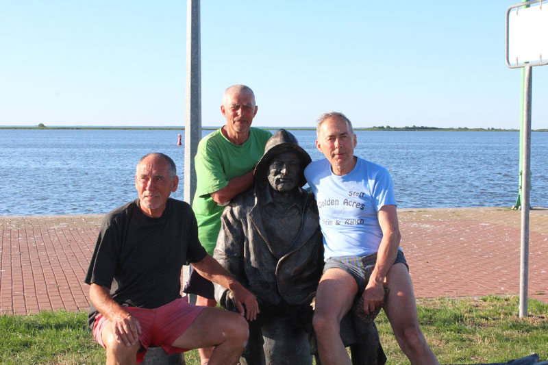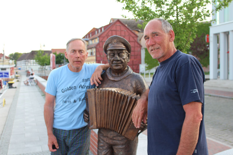 3 lipca – piątek. Sprawdziłem prognozy pogody, przez najbliższe dwa dni mają być wiatry południowe i upały rzędu 30° C, po tym okresie ma być szorstko. Już miałem uruchomić silnik żeby odpłynąć, gdy pojawił się Henryk z dorodnym leszczem w ręce. Byłem całkowicie zaskoczony, a Piotr chyba nie mniej. Cóż stoimy, dałem Henrykowi wiadro, nóż i poszedł oczyścić swoją zdobycz. Okazało się, że również głowę leszcza zachował bo zrobił zupę ucha. Po minięciu Altwarp postawiliśmy żagle, wiatr 2-3° B E, słońce, na niebie wysokie chmury. Pełnia gorącego lata. Przy pławie Haff powinniśmy trzymać kurs 270°, ale efektywniejsza jest żegluga kursem 310. Wiatr wieje zgodnie z prognozą. Baksztagowy kurs jest efektywniejszy od pełnego, pracują wszystkie żagle. Dopłynęliśmy do przystani przy moście w Karnin, gdzie Henryk przygotował obiad, na który został zaserwowany leszcz, Piotr w tym czasie sprawdził co ciekawego jest w okolicy. Z upalnej przystani wypłynęliśmy ponownie na Kleines Haff. Wiatr od dzioba więc na silniku dopłynęliśmy do Ueckermünde o 2000 i zatrzymaliśmy się w przystani Seesportclub Vorpommern e.V.. Tu jak się okazało bosmana nie było, a dostęp do toalety jedynie przy pomocy klucza, po opłaceniu postoju. Na szczęście w sąsiednim klubie toaleta była dostępna i to dzięki uprzejmości członka tego klubu, który był na jachcie. Poszliśmy zwiedzać miasto, w którym życie o tej porze dnia zamiera. Nawet sklep sieci NETTO był już zamknięty.