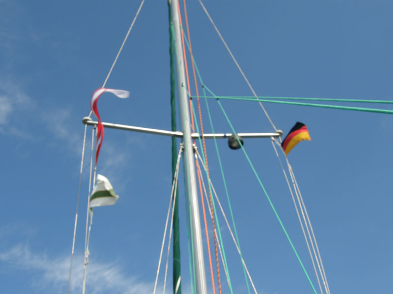 4 lipca – sobota. Daliśmy sobie pospać. Zapowiada się kolejny upalny dzień, zatem plany pokonywania trasy z natury rzeczy nie mogą być zbyt ambitne. Wyruszyliśmy o 1000, żagle mogliśmy postawić już na torze przed pławą UE4/B2 i kursem zbliżonym do oczekiwanego, ostro na wiatr Henryk sterował do Kamminke. Jednym halsem dopłynęliśmy w okolice portu, zrzuciliśmy żagle i powoli na silniku wpłynęliśmy za falochron. Sonda zaczęła piszczeć, że jest płytko, szczęśliwie zacumowaliśmy do wysokiego, betonowego nabrzeża. Wszyscy dla ochłody poszliśmy się wykąpać na pobliskie kąpielisko. Po tej przyjemności wróciliśmy na jacht i postanowiliśmy płynąć do Wapnicy. Zjedliśmy przygotowany przez Piotra i Henryka obiad, po godzinie postoju wypłynęliśmy w stronę granicy. Mimo pozornie mizernego wiatru rozwijaliśmy prędkość 3-4 węzły. Dalej półwiatrem dopłynęliśmy do pławy głębokiej wody M-1 i od tego miejsca przy pomocy silnika dopłynęliśmy do Mariny Wapnica, bosman pozwolił nam stanąć przy Y-bomie na stanowisku nr 2. Nim się zorientowałem i poszedłem z Piotrem opłacić nasz postój, Henryk już miał klucz do toalety oraz szereg map i informatorów, wypytał o wszystko co go interesowało. Kolacja, gin z tonikiem i komary, zapełniły nasz wieczór.