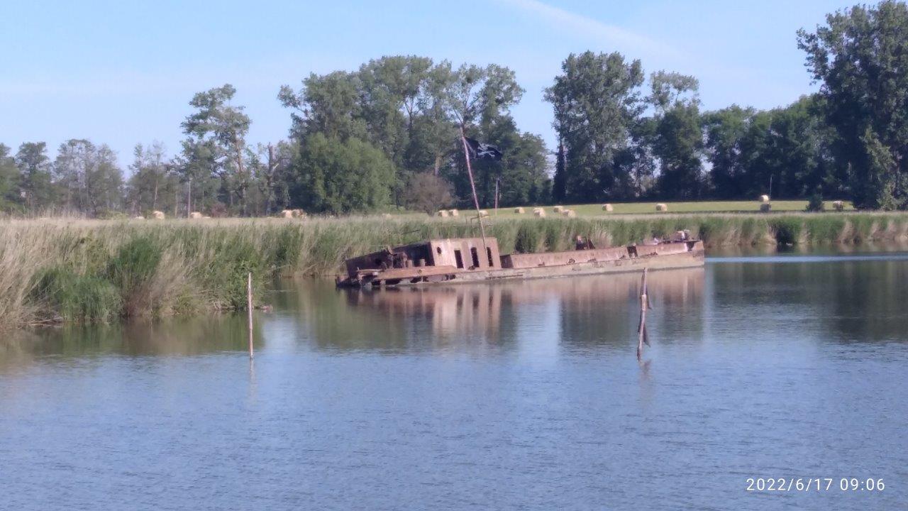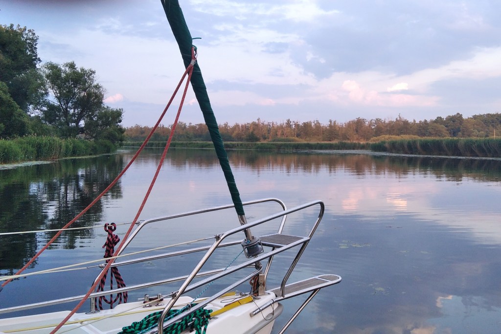 Rzucamy cumy i płyniemy na j. Dąbie. Chowamy się na noc na rz. Świętej w tzw. „zakątku”. To są nowo wybudowane z funduszy EU mini super pomosty z wiatami, stołami i co ważne z TOI TOI i to wszystko na wodzie. Nie ma możliwości wyjścia na brzeg. Jest cicho, b. czysto i klimatycznie. Nad nami błotniaki polują, kukułka kuka a żaby dają koncert. W oddali słychać Szczecin pracujący. Rano jak to w rz. Świętej tak jak w Gangesie trzeba się wykapać-oczyścić.