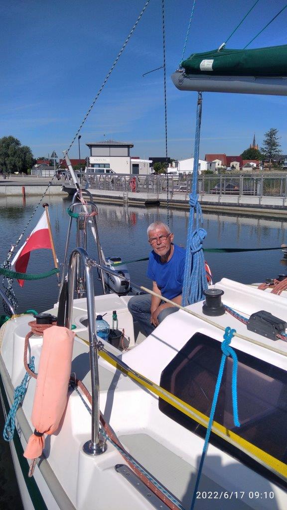 Następnego dnia zawijamy do portu Rankwitz. Też trwa tam kompletna przebudowa. Port niewielki i dużo turystów-przyjechali samochodami. Małe zakupy spożywcze. W sklepie są fajne zupy w puszkach 1 litr tzw. „eintopf”, cena też dobra. Na trasie nie za wiele żagli. Tłoku nie ma. A my, a to na żaglach, a to na silniku jak Neptun pozwala. Spieszymy się z wypłynięciem z portu, żeby zdążyć na otwarcie mostu w Wolgast chyba o 1200. Zdążyliśmy. Na razie horyzont w zasięgu wzroku i trzymanie kursu nie sprawia problemu. Płyniemy nurtem rz. Peene raz przy sterze Józek raz ja. Pogoda korzystna.