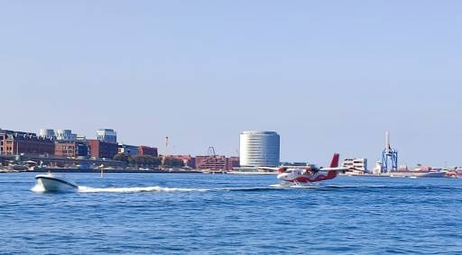 Wpływamy w kanały portowe Kopenhagi. Przy samym wejściu witają nas liczne wiatraki. A na kanale cumują ogromne wielopiętrowe wycieczkowce, płyną jachty, duże i małe motorówki i całkiem spore stateczki a wśród nich kajaki. Wszystkiego się spodziewaliśmy, ale żeby w tym kanale pływały również samoloty. Co prawda sportowe, które u wyjścia zaraz startowały z wody.