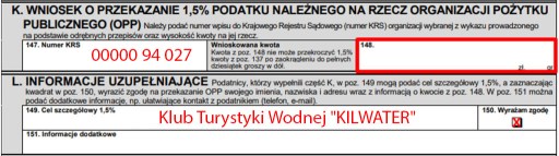 W dodatkowych informacjach (poz.128 formularza PIT-37) należy wpisać: „Klub Turystyki Wodnej KILWATER”.