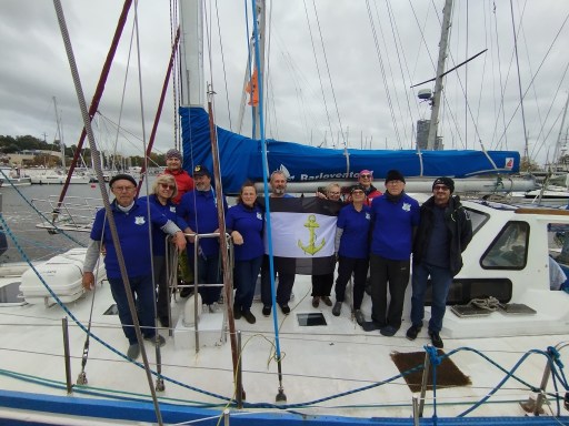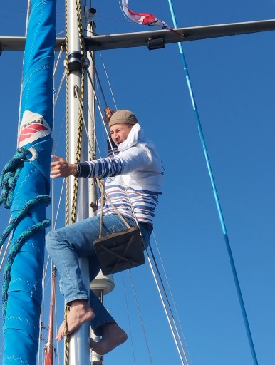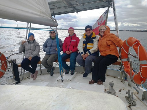 Mamy też przyjemność taką, że płynie z nami również armator Tomek w roli bosmana jak mówi Stefan. Załadunek naszych bambetli i trochę szpejostwa poszedł sprawnie. Ważnym elementem każdego rejsu jest szkolenie bhp, zakładanie szelek i oczywiście obsługa wc.