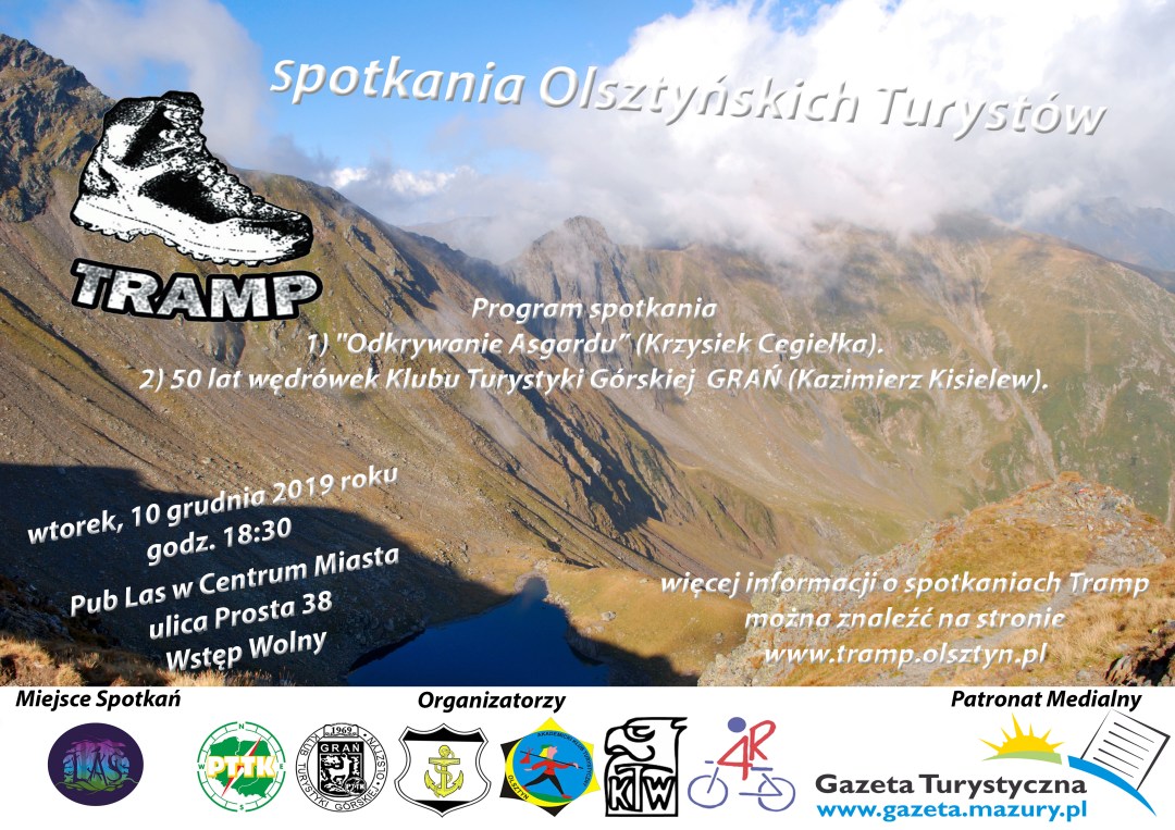 Zapraszamy na Spotkanie Turystów TRAMP we wtorek 10 grudnia o godz. 18:30 do Pubu LAS. Tematy: "Odkrywanie Asgardu" - prelegent Krzysiek Cegiełka. "50 lat wędrówek Klubu Turystyki Górskiej GRAŃ" - prelegent Kazimierz Kisielew. Nowe miejsce spotkań - Pub LAS, ul. Prosta 38 (starówka). Pub LAS (były Pub Mech) znajduje się w podwórzu pomiędzy ulicami Prostą i … Czytaj dalej Spotkanie TRAMP – 10.12.2019 w Pubie LAS