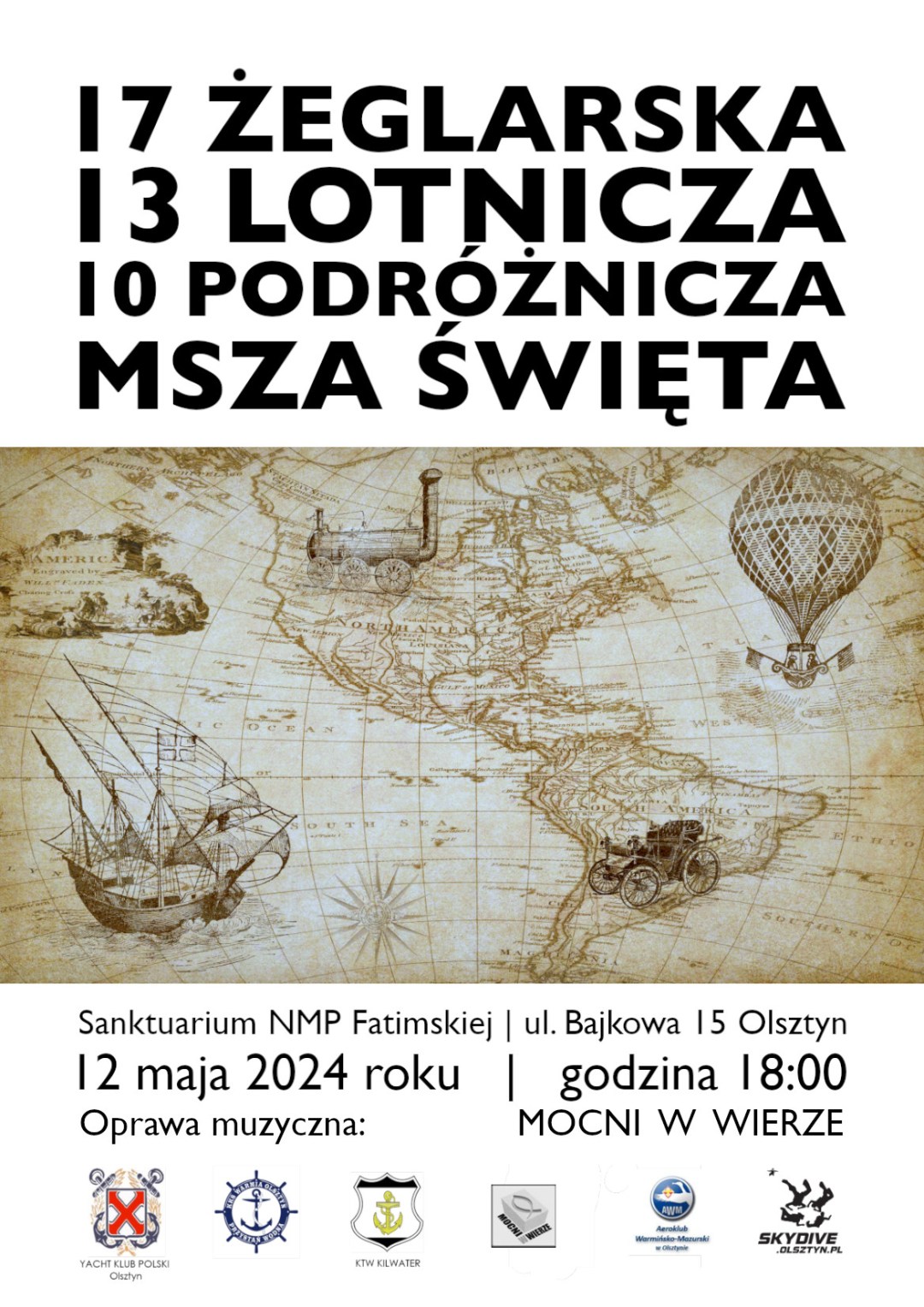 W imieniu organizatorów zapraszamy serdecznie na 17 Mszę Świętą Żeglarską, która się odbędzie w niedzielę 12 maja o godzinie 18:00 w Sanktuarium Matki Boskiej Fatimskiej (ul. Bajkowa 15) w Olsztynie. Będzie to czas na wspólną modlitwę za pomyślność wszystkich podróżujących, oddanie Bogu wdzięczności za dotychczasowe łaski i prośbę o opiekę na kolejnych szlakach wodnych, powietrznych i … Czytaj dalej 17 Żeglarska Msza Święta – niedziela 12 maja